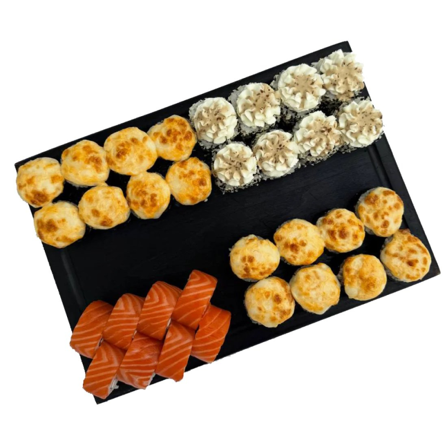 Запечённый ролл с тунцом, запечённый ролл Калифорния в кунжуте, запечённый ролл Нежный краб, запечённый ролл Чикен, запечённый ролл Терияки.