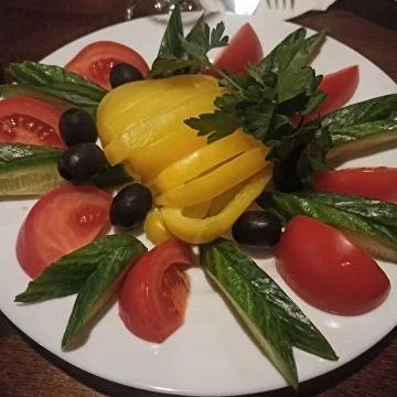 Помидор, огурец, перец, салатный лист, петрушка, маслины, оливки.