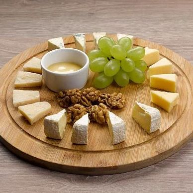 Сыр Дор-Блю, сыр Пармезан, сыр Филадельфия, сыр Чеддер, виноград, грецкие орехи, мед, салатный лист, петрушка.