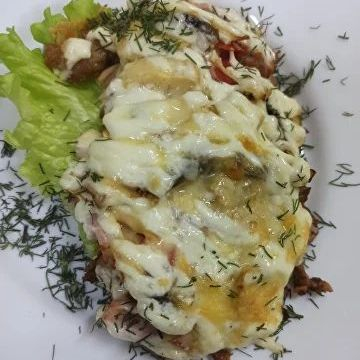 Свиная корейка, ветчина, сыр, шампиньоны, помидоры, майонез.