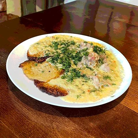 Колбаса домашняя, свиная шея, драники, сметанный соус.