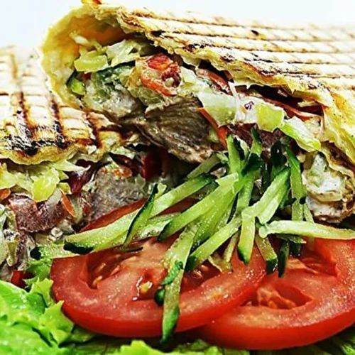 Салат из белокочанной капусты, огурец маринованный, томат свежий, соус чесночный, соус кисло-сладкий базиликовый, курица на углях.