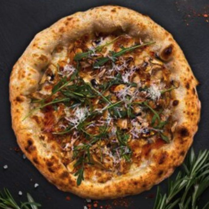 Заказать Нежное тесто из муки la napoletana, покрытое соусом бешамель. Сверху - сыр моцарелла, грибы шампиньоны, нежное мясо цыпленка, соус сладкий чили, хрустящий жареный лук и тёртый пармезан, свежая руккола и нотки чесночного масла.