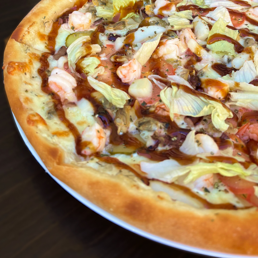 Соус сливочно-чесночный с кунжутом, сыр Моцарелла, креветки, морской коктель, томат свежий, огурец маринованный, айсберг, соус терияки, масло чесночное, орегано.