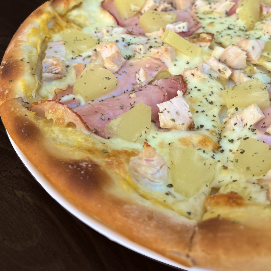 Соус сырный, сыр Моцарелла, филе цыпленка, ветчина, ананас, масло чесночное, орегано.
