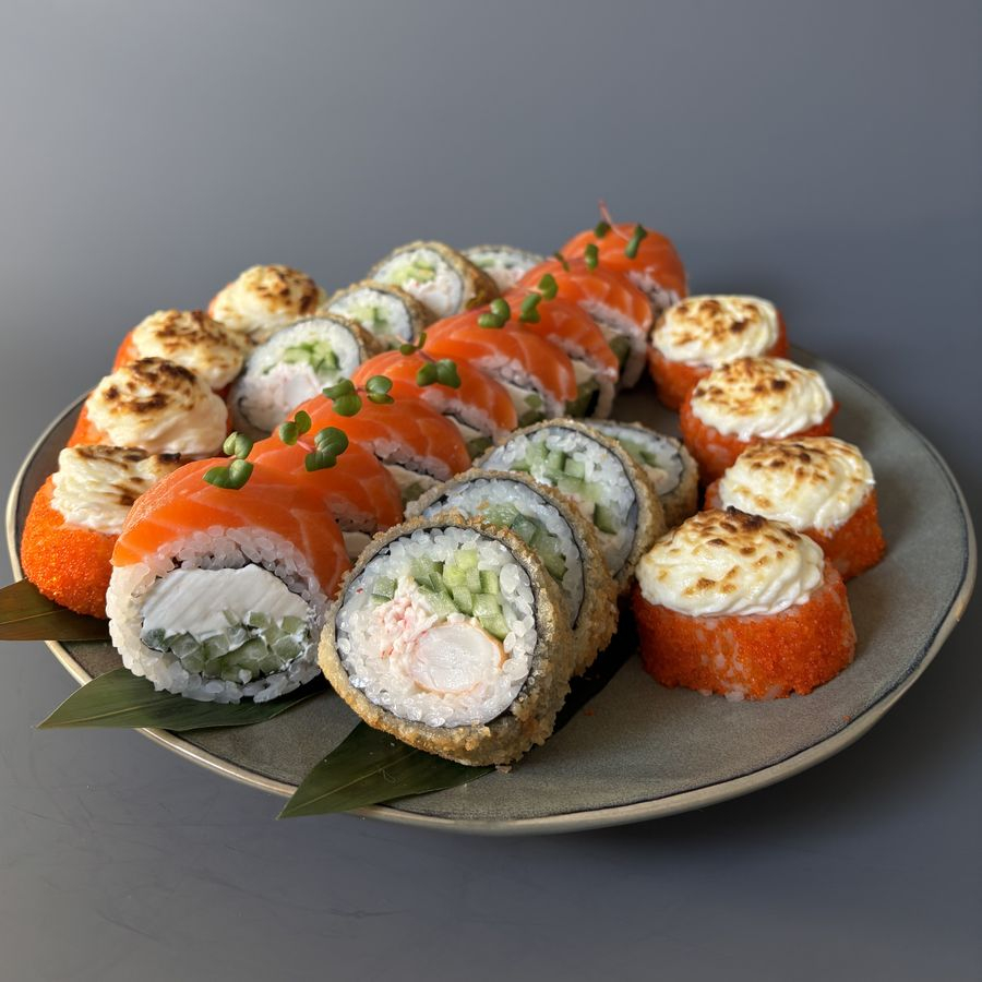 Филадельфия с персиком и авокадо, ролл татаки тунец, Филадельфия мини.