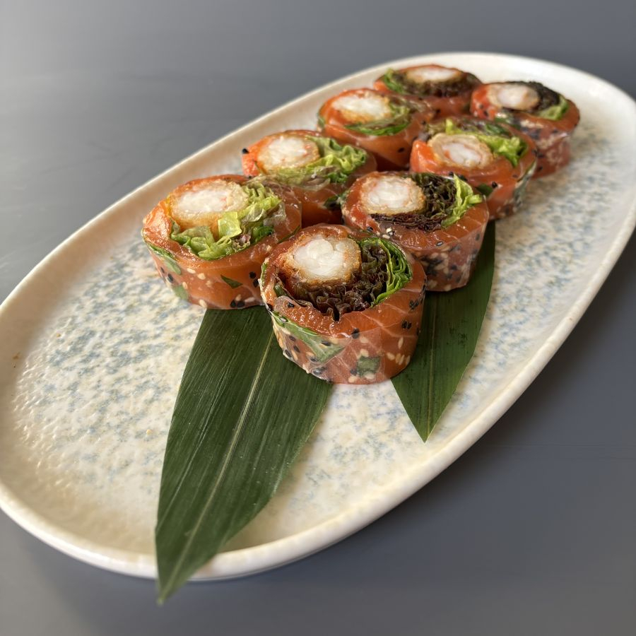 Рисовая бумага, кунжут черно-белый, лук зеленый, лосось, салат, темпурная креветка.