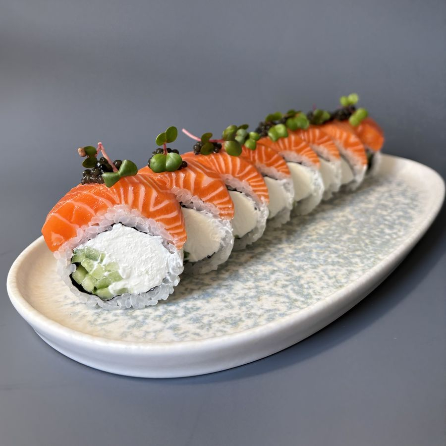 Рис, нори, лосось, сыр творожный, огурец, икра черная.