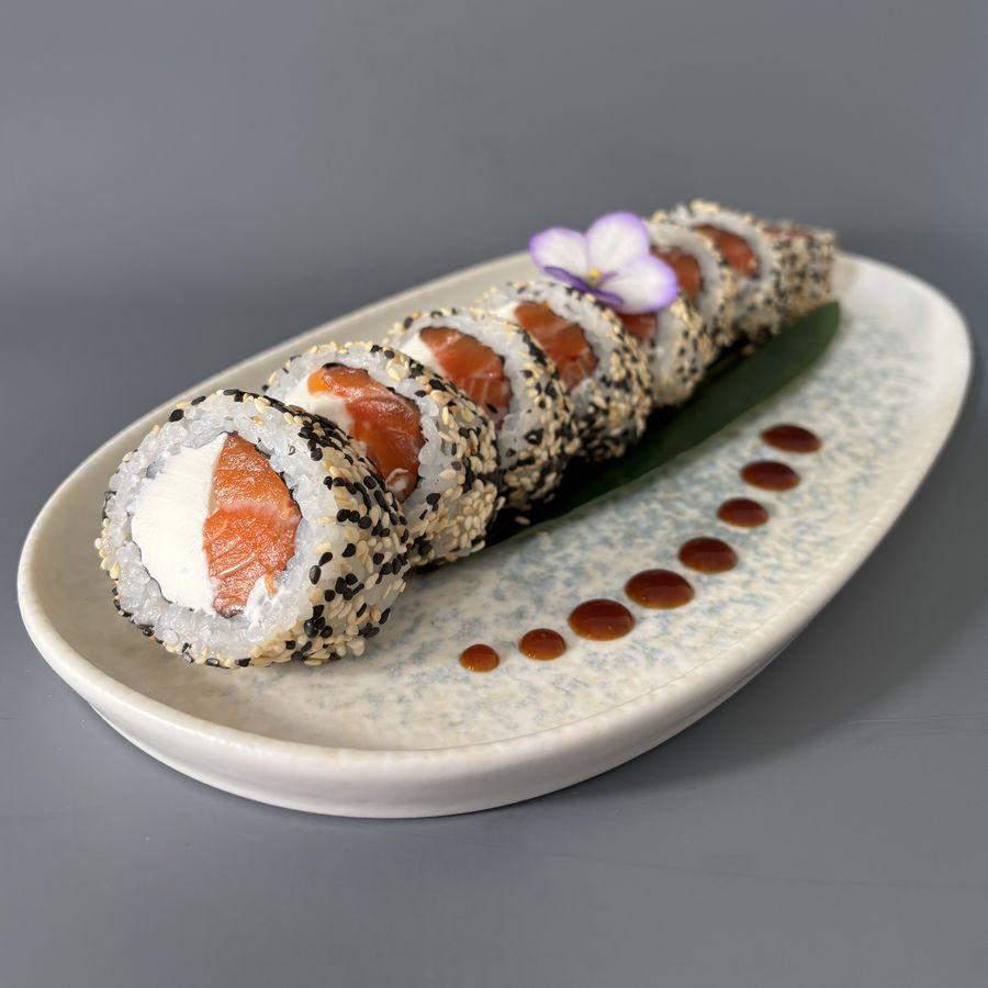 Рис, нори, лосось, сыр творожный, кунжут черный, кунжут белый.