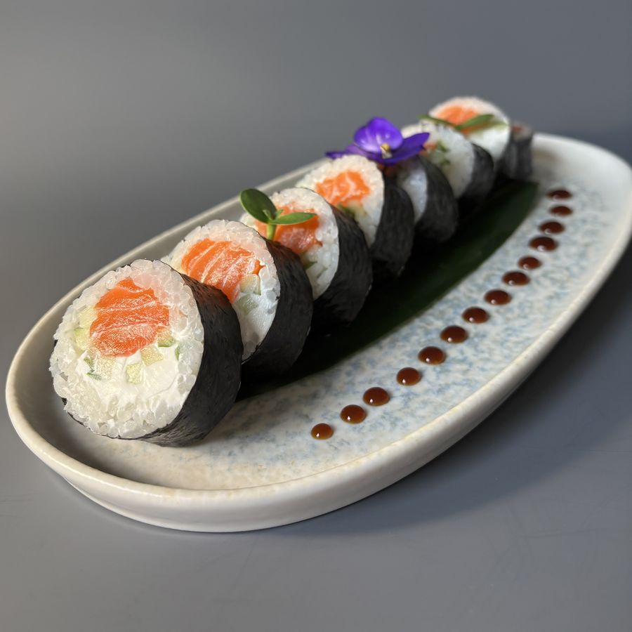 Рис, нори, лосось, сыр творожный, огурец, икра черная.