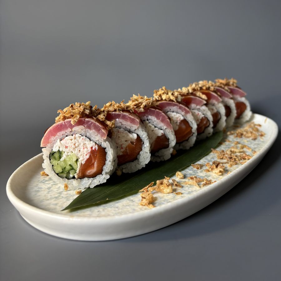 Рис, нори, лосось, снежный краб, огурец, тунец, лук жареный, соус терияки.