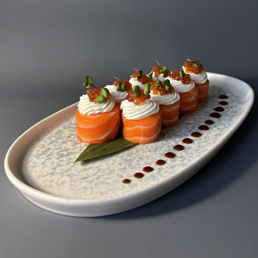 Рис, нори, лосось, сыр творожный, икра лососевая.