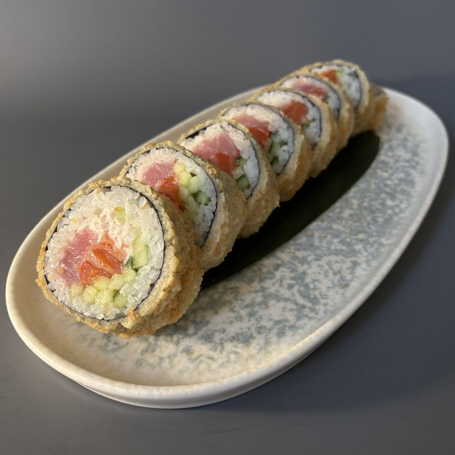 Рис, нори, лосось, тунец, снежный краб, огурец, кляр, сухари панко.
