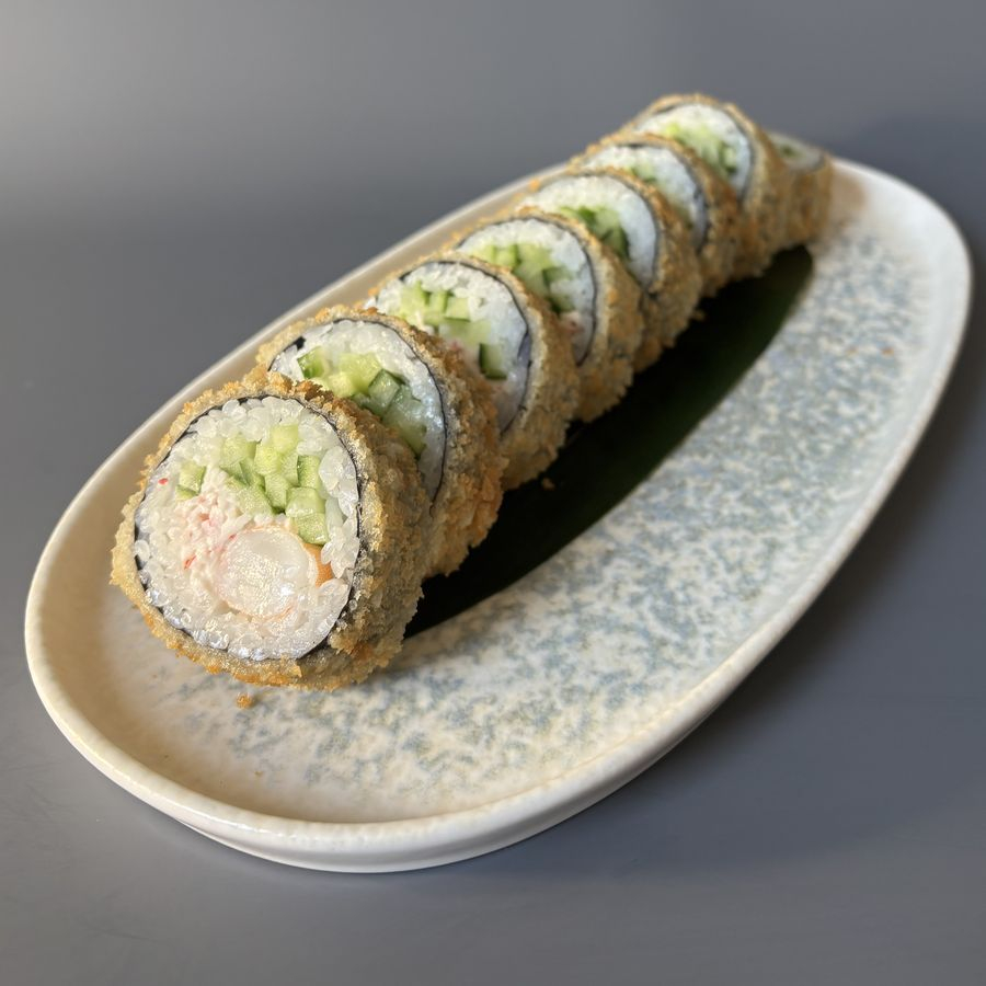 Рис, нори, креветка, снежный краб, огурец, кляр, сухари панко.