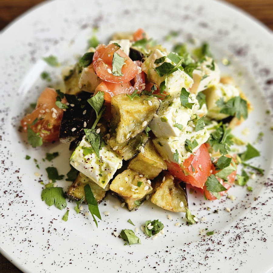 Это яркое и насыщенное блюдо, в котором обжаренный во фритюре баклажан в крахмале прекрасно сочетается с сочными томатами и нежным сыром феты. Фирменное зеленое масло придает салату аромат и свежесть, а кунжут добавляет приятную текстуру и ореховый вкус. Украшенный зеленью, этот салат станет не только вкусным, но и эффектным дополнением к любому столу!