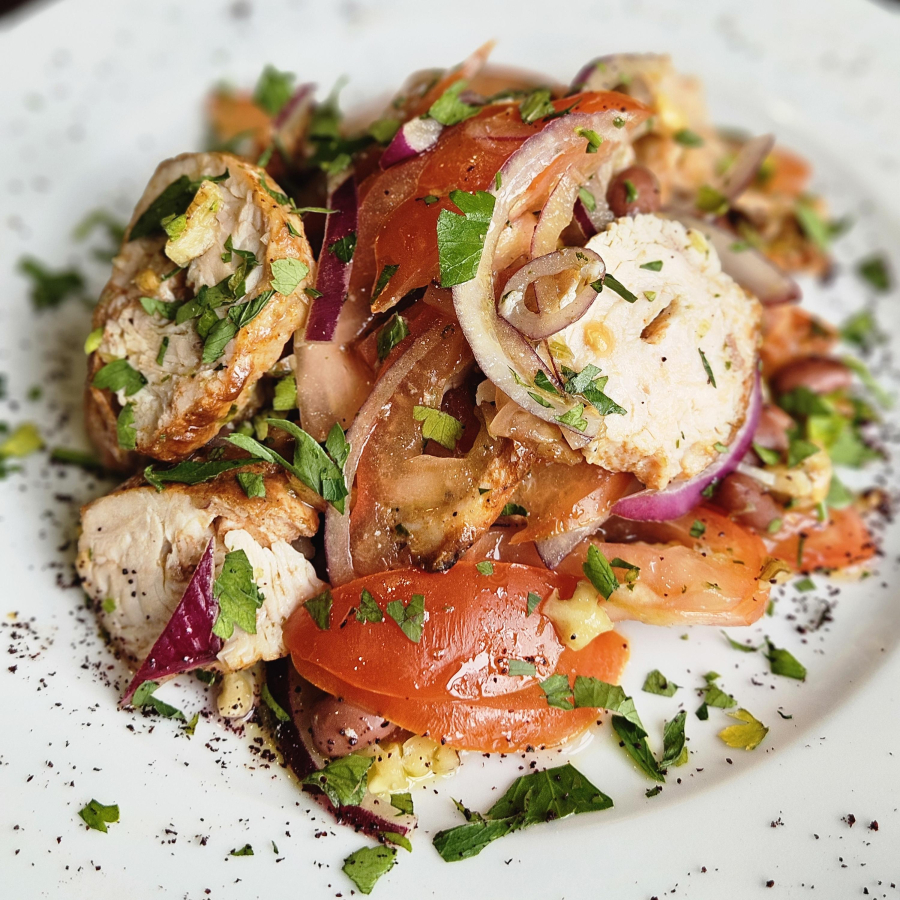 В основе лежит нежное запеченное куриное филе, которое идеально дополняется сочными свежими томатами и хрустящей фасолью. Лук добавляет легкую остроту, а грецкий орех вносит нотку ореховой сладости и текстуры. Все ингредиенты заправлены ароматным зеленым маслом и щедро посыпаны свежей петрушкой, что придает салату свежесть и яркий цвет. Этот салат станет отличным дополнением к любому столу и порадует даже самых требовательных гурманов!