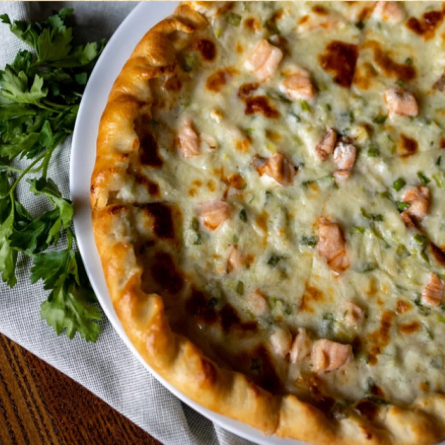 Заказать Пирог из дрожжевого теста, с соусом из сыра и сметаны, горбушей и зеленым луком.