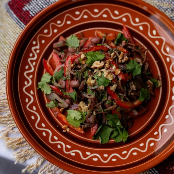 Заказать Традиционный грузинский салат с говядиной, сладким перцем, красной консервированной фасолью, репчатым луком, грецким орехом, чесноком, зеленью, винным уксусом и грузинскими специями.