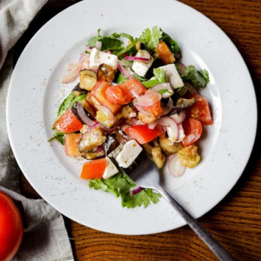 Заказать Салат с баклажаном, томатами, сыром брынза, красным луком, чесноком, зеленью, заправлен ароматным маслом с грузинскими специями и кинзой.
