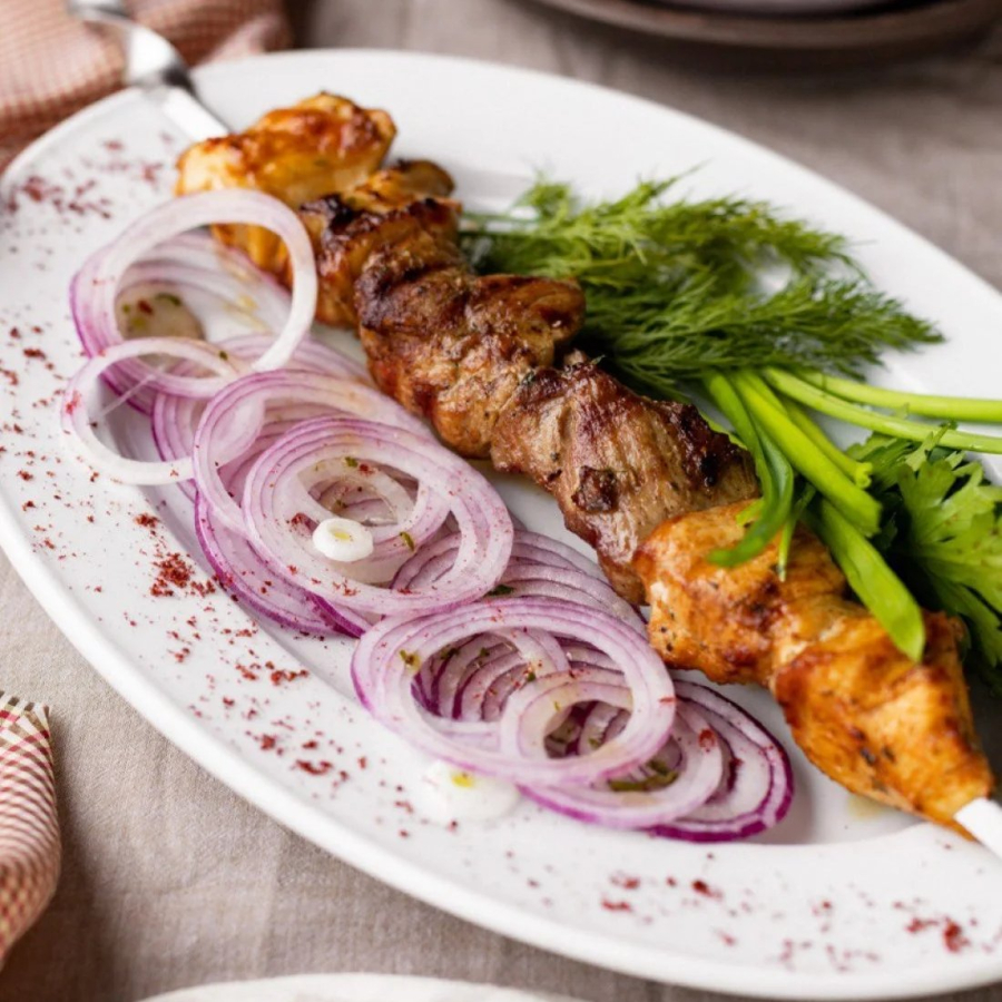 Сочные кусочки птицы и свинины, маринованные в грузинских специях, обжаренные на мангале, подаются с красным луком и ассорти из зелени.