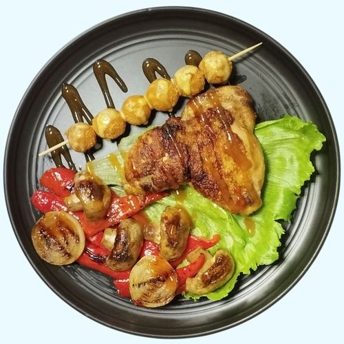 Заказать Курица гриль, овощи гриль, картофельные крокеты, соус.