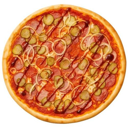 Заказать Хот-дог борт, пицца-соус, Моцарелла, фарш фирменный обжаренный, белый соус, салями, бекон, пепперони, огурцы маринованные, лук маринованный, соус барбекю.