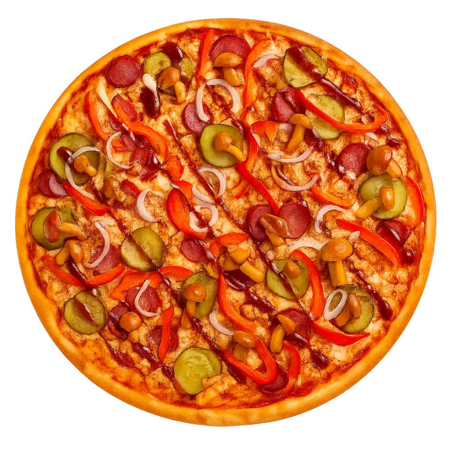 Пицца соус, моцарелла, фарш обжаренный, колбаски охотничьи, огурец маринованные, опята маринованные, перец маринованный, лук маринованный, белый соус, барбекю соус.