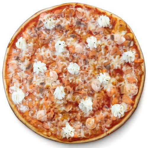 Пицца-соус, моцарелла, лосось, креветки, кремчиз, кунжут, соус терияки.