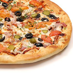 Бекон, салями, томаты, корнишоны, маслины, моцарелла, соус Барбекю, петрушка.