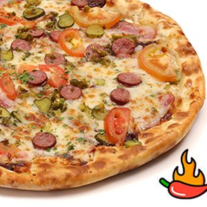 Говядина, колбаски охотничьи, шампиньоны, томаты, моцарелла, халапеньо, лук красный, соус сливочный, соус гриль, петрушка.