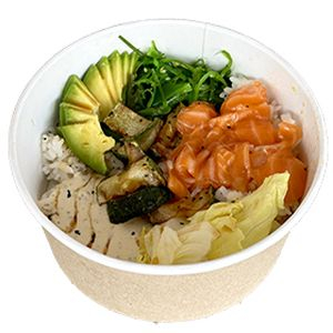 Лосось, авокадо, запечённый кабачок, водоросли чука, рис, салат, соус понзу, соус сливочно-ореховый, грейпфрутовый соус.