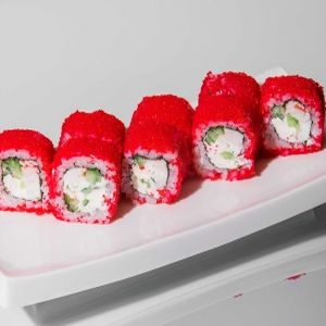 Снежный краб (имитация), сливочный сыр, огурец, соус Айоли, икра тобико, рис, нори.