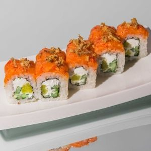 Лосось, сливочный сыр, такуан, огурец, икра тобико, соус спайс, лук фри, рис, нори.