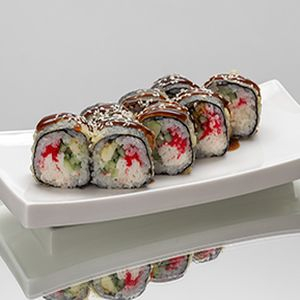 Снежный краб (имитация), икра летучей рыбы, кунжут, рис, авокадо, огурец, соус унаги, сливочный соус, кляр, нори.