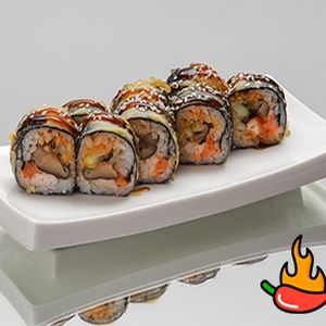 Лосось, курица копчёная, грибы шиитаке, огурец, соус унаги, соус спайс, кунжут, рис, кляр, нори.