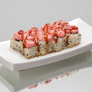 Тунец, копчёная курица, сливочный сыр, соус унаги, икра летучей рыбы, сливочный соус, кунжут, рис, нори.