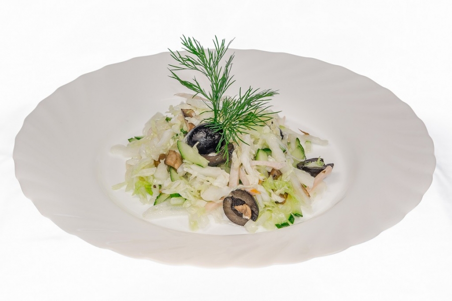 Капуста пекинская, огурцы, шампиньоны, ветчина, маслины, масло подсолнечное.