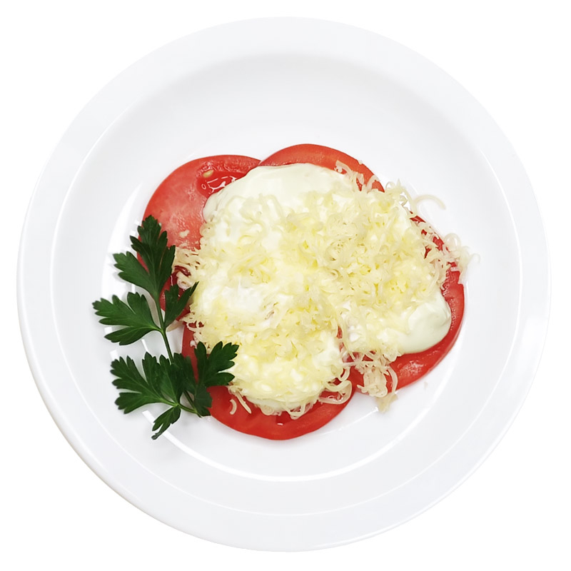 Помидоры, сыр, майонез, чеснок.