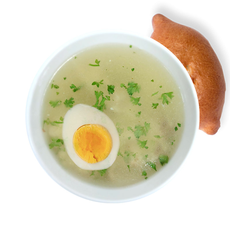 Бульон из птицы, яйцо вареное, пирожок печеный с птицей, луком и яйцом.