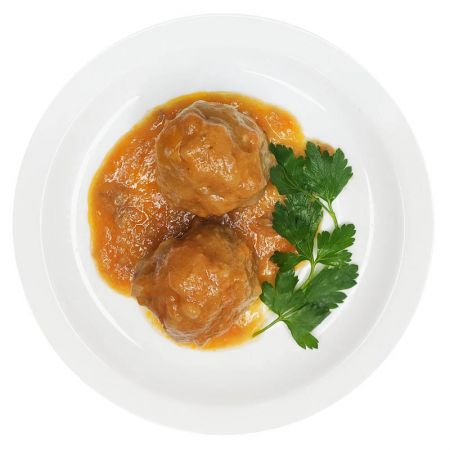 Свинина, лук репчатый, батон, мука пшеничная, соус сметанный с грибами, соль, специи.