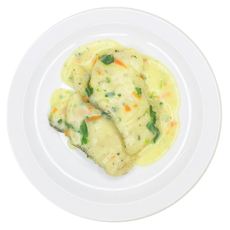 Филе рыбы, припущенное со сливочным соусом и шпинатом