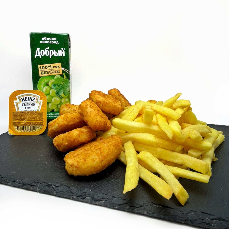 Заказать Наггетсы куриные 170 гр, картофель 170гр, соус Heinz на выбор, сок 0,2.