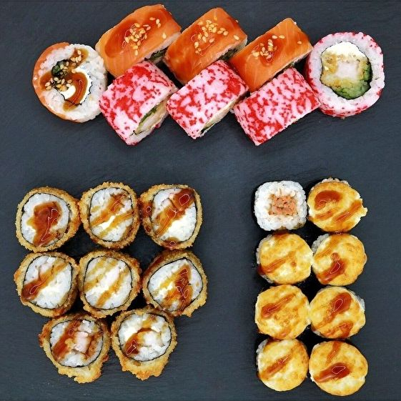 Филадельфия (8шт), Бонито (8шт), Канадский сливочный (8шт), Темпура с лососем (8шт), Акита запеченный (8шт), Сакура запеченная (8шт), Сёгун запеченный (8шт).