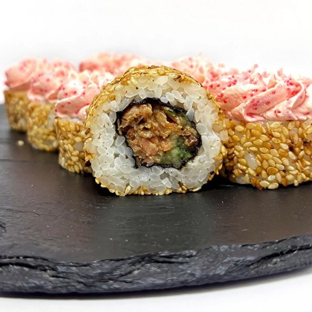 Курица жаренная, крем чиз, томат, лук Кранч, рис, нори, унаги соус.
