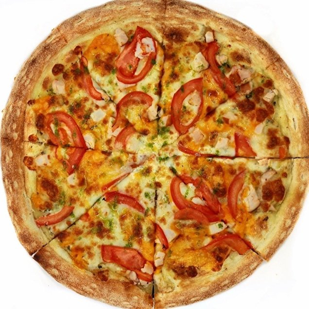 Основа чесночный соус, ветчина, куриное филе, томаты, сыр чеддер, сыр моцарелла, зеленое масло.