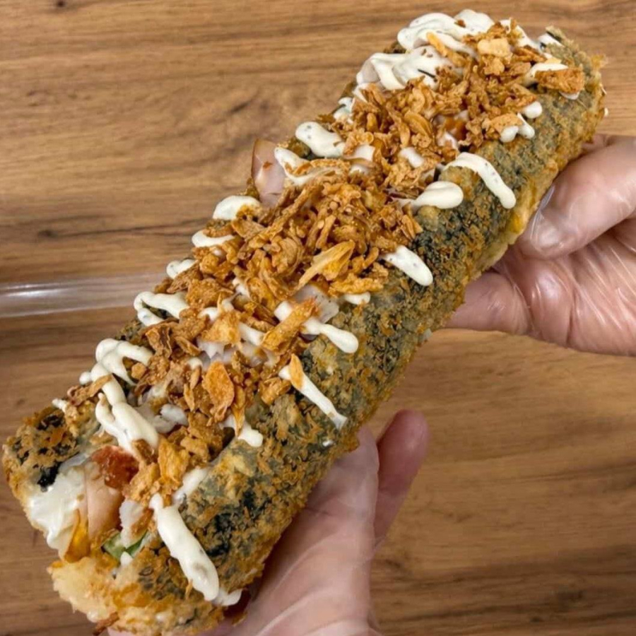 Рис, нори, сыр, копченая курица, огурец, соус чесночный, лук Крипси.