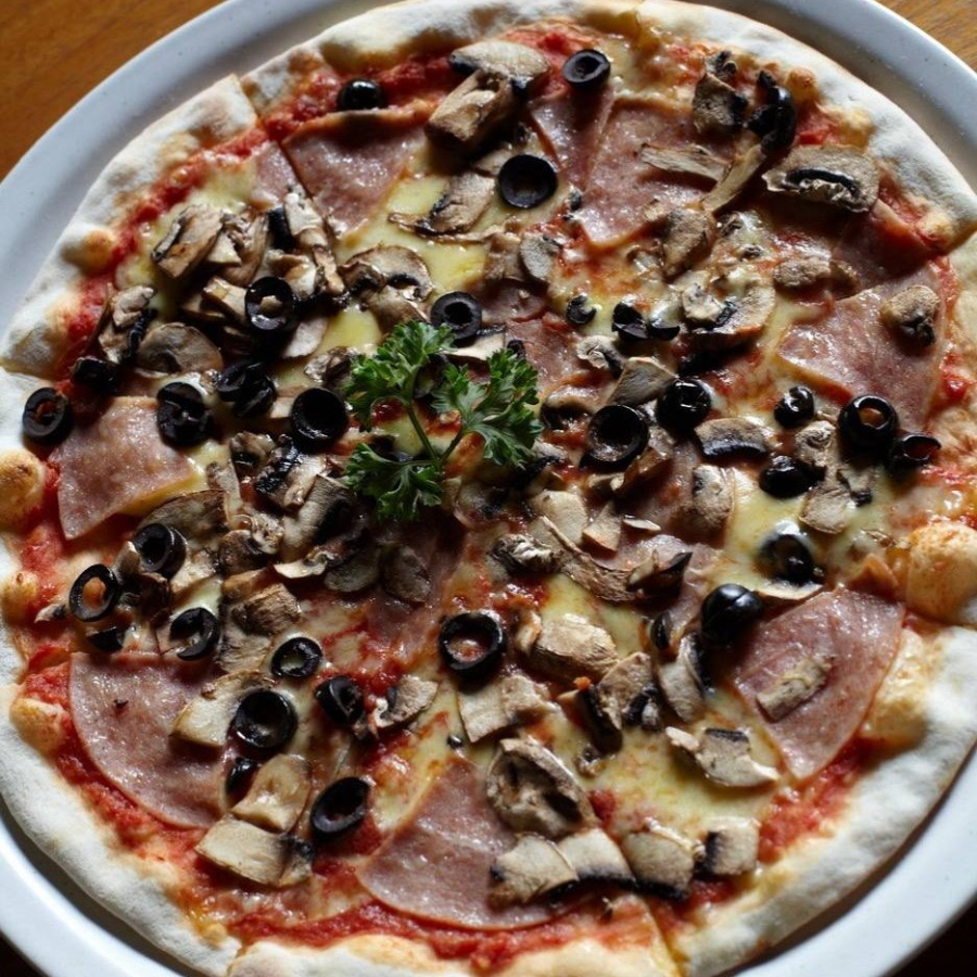 Томатная основа, сыр Моцарелла, ветчина, грибы, маслины.