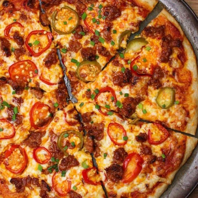 Томатная основа, сыр Моцарелла, ветчина, фарш свино-говяжий, томат, перец Халапеньо.