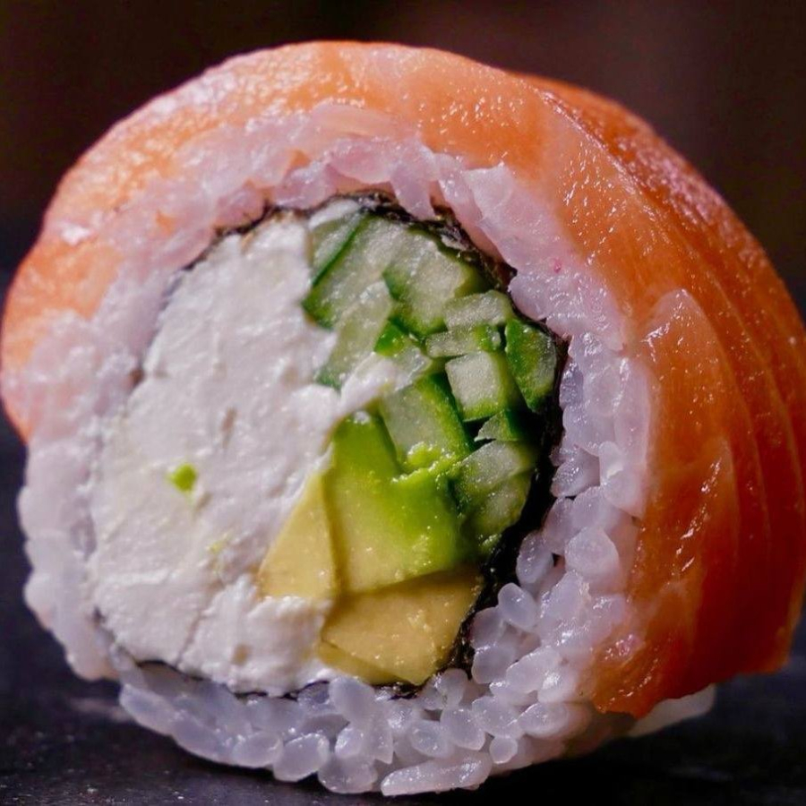 Рис, нори, сливочный сыр, лосось, авокадо, огурец.