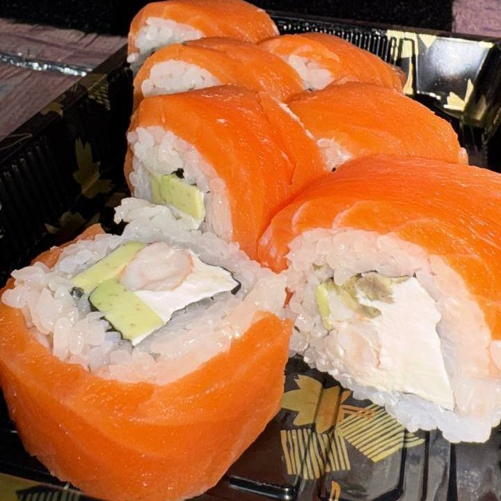 Нори, рис, творожный сыр, лосось, авокадо, тигровая креветка.